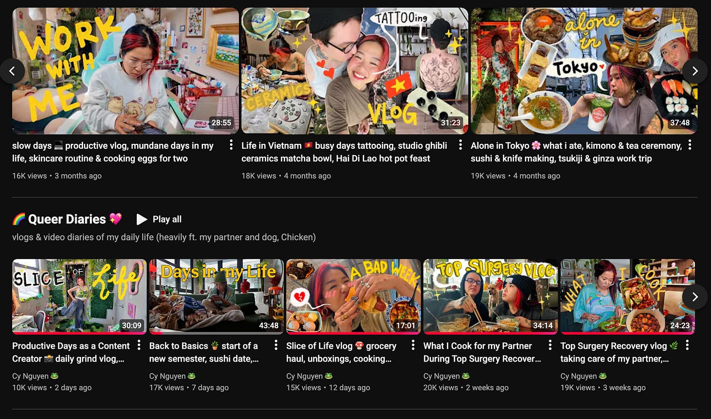 I! LOVE! CY! i need to start by bragging about the fact that i was lucky enough to travel to Thailand with Cy as part of a TrovaTrip experience a few years back, and we’ve been cross-country friends ever since. i was already a fan of her content long before we traveled together, but her youtube vlogs have become my go-to comfort watches. her voice has always been so soothing to me and i just love following along as Cy and Cass (LOVE YOU TOO CASS!) live their Boston lives, eat delicious foods, share lovely moments with friends & with their trusty companion pup named Chicken. ok i gotta brag again because i’m featured in one of the vlogs when they visited Chicago last year!!! <3 <3 <3