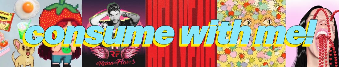 hello and welcome to my first compilation of some multimedia tidbits that i gobble up on a regular basis! i hope to make this list an ongoing thing where i can document what i’m cycling through—books, albums, pieces of writing, memes, images, podcasts, anything that’s findable online really—plus include my own anecdotes & takes along the way. think of it like a “what’s in my bag” feature but instead it’s “what’s in my media intake.” yummy!