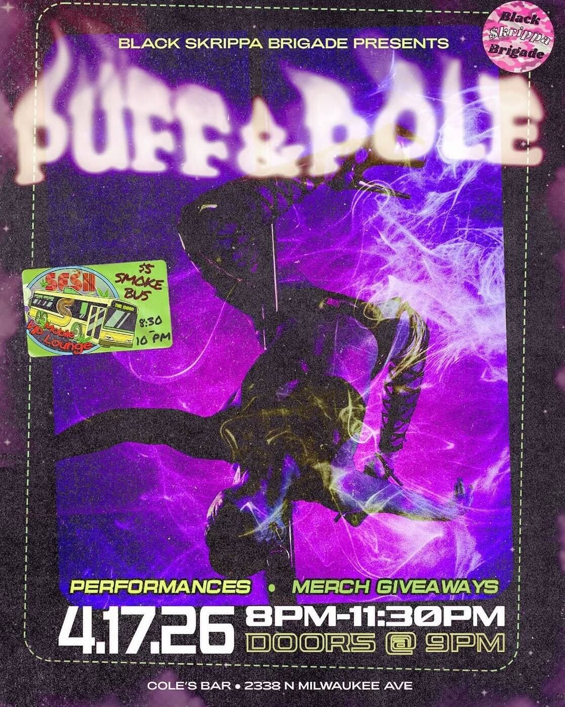 back with my favorite BSB babes for a 4/20 weekend kickoff & pole show at cole’s! the music’s gonna be hot, the performers will be even hotter, there’s a sesh bus and merch giveaways…need i say more?! 💜💨